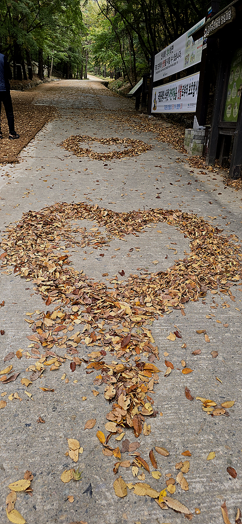 누군가 낙엽을 모아 하트모양을 두개나 만들어 놓았다.